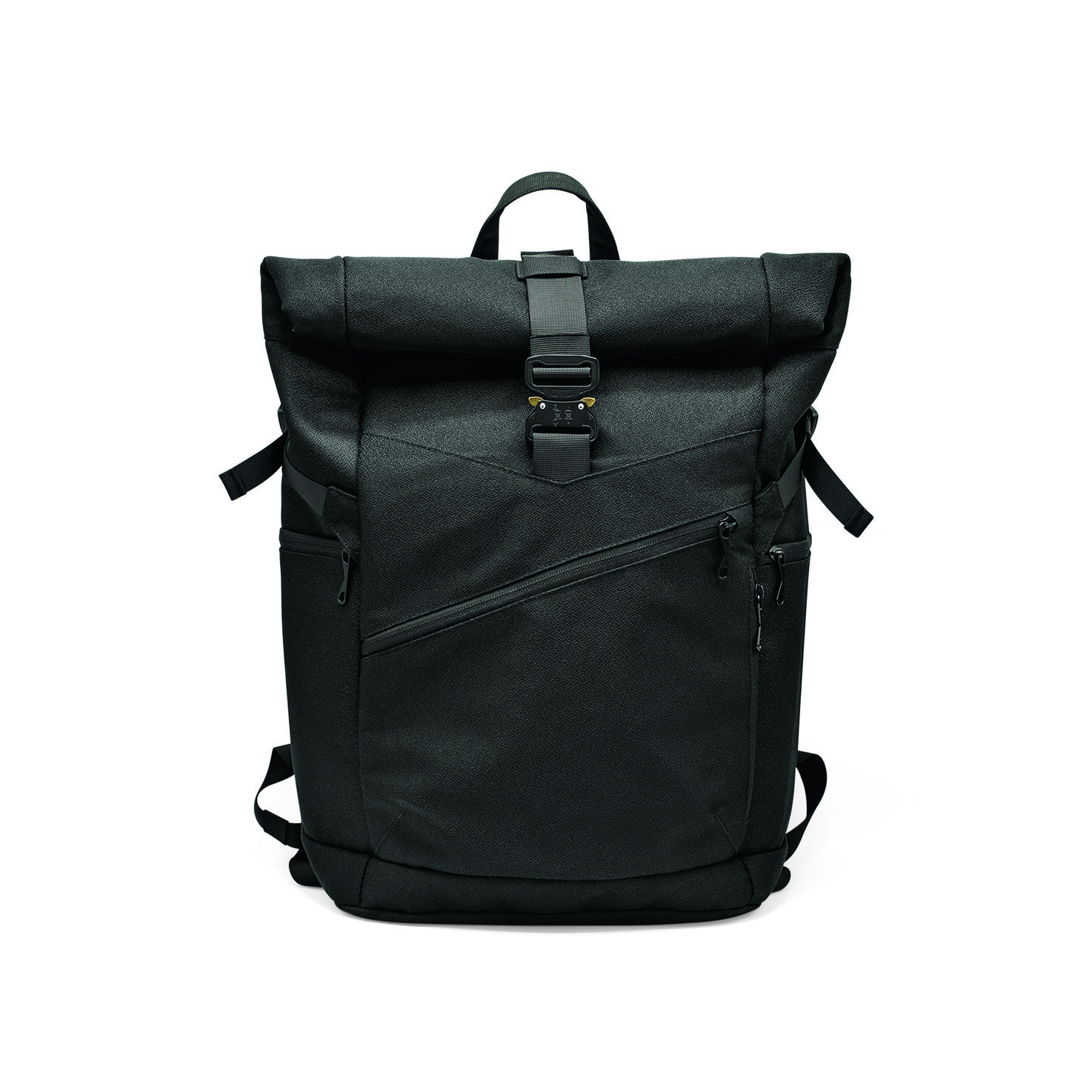 - Roll top shape with aluminum seat belt quick release buckle closure
